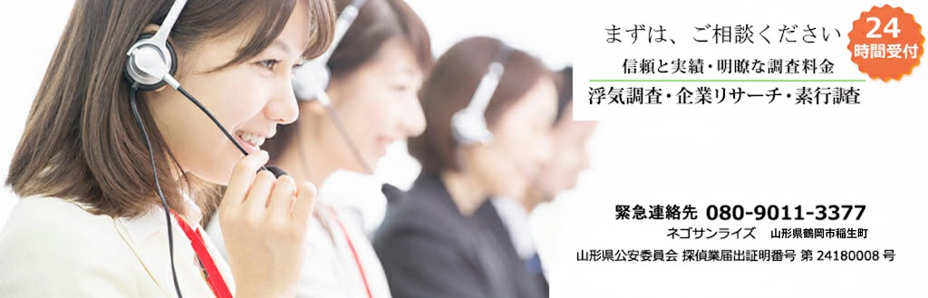 ネゴサンライズは、鶴岡市・酒田市・庄内エリアを拠点に、30年間にわたり企業や個人のお悩み解決に取り組んできた探偵事務所です。